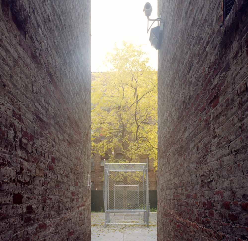 The concept for Ghost House originates with my Fences Furniture sculptures, a set of furniture constructed entirely of chain link fence. Ghost House expands on this concept to delineate the entire home, inspired in part by the many baseball backstops in Randall's Island Park. This sculpture also suggests, subtly, architect Frank Gehry's innovative use of chain link fence in his early Santa Monica home. The name Ghost House recalls architect Philip Johnson's structure of the same title in New Canaan, CT.